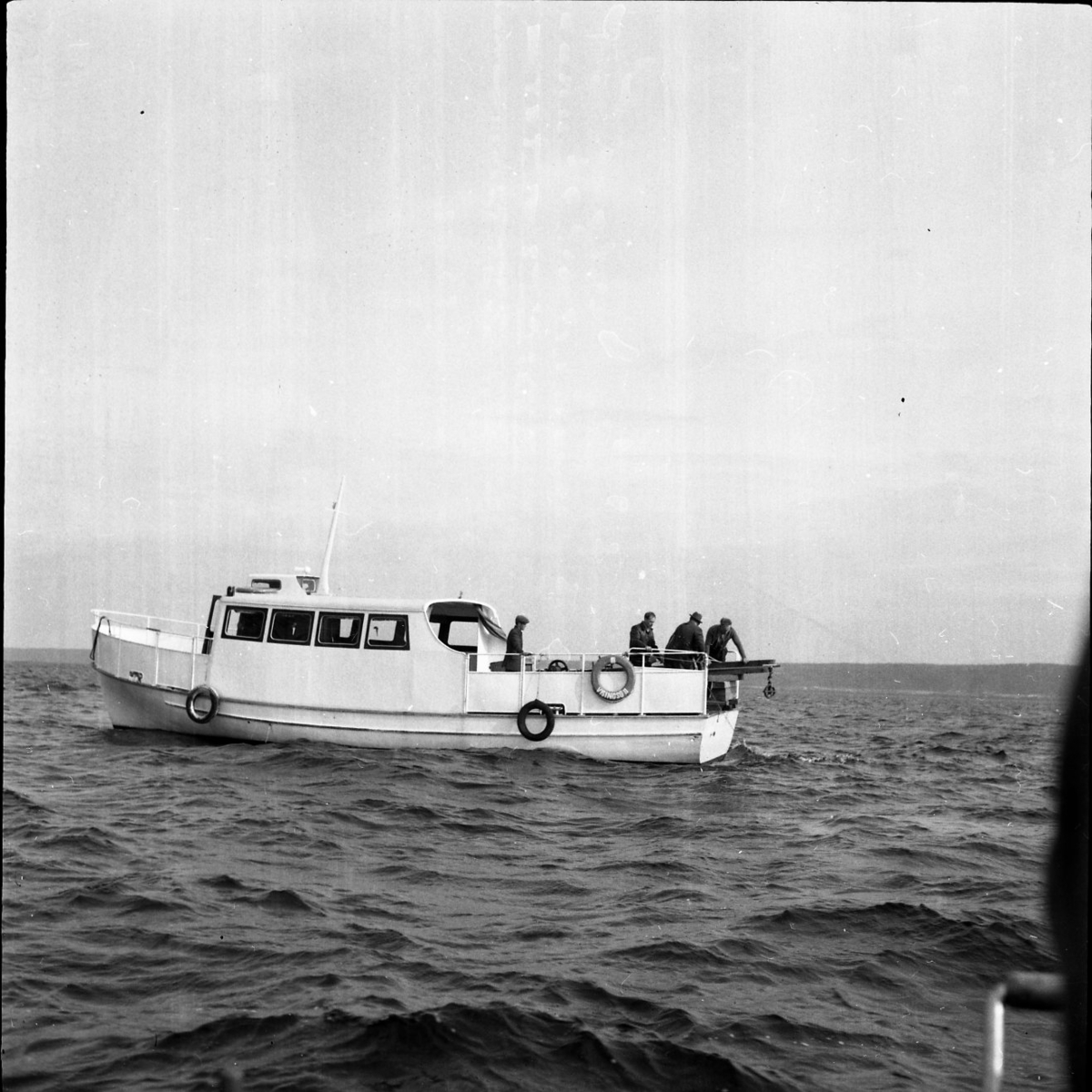 Flera personer står på fartyget m/s Visingsö. En person halar upp ett rep från sjön.