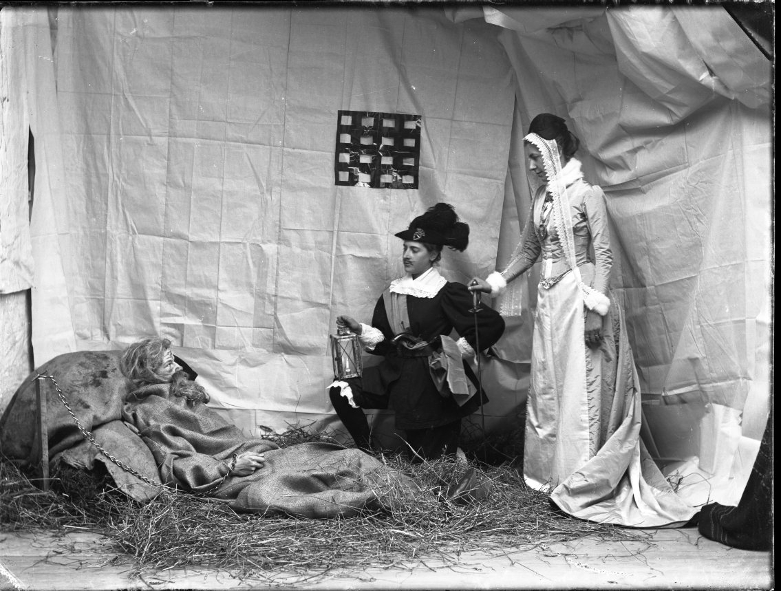 En historisk tablå. Två adligt klädda står respektive sitter vid en skäggig man klädd i trasor som ligger kedjad på golvet. Någon av de agerande heter sannolikt Gyllenhjelm.