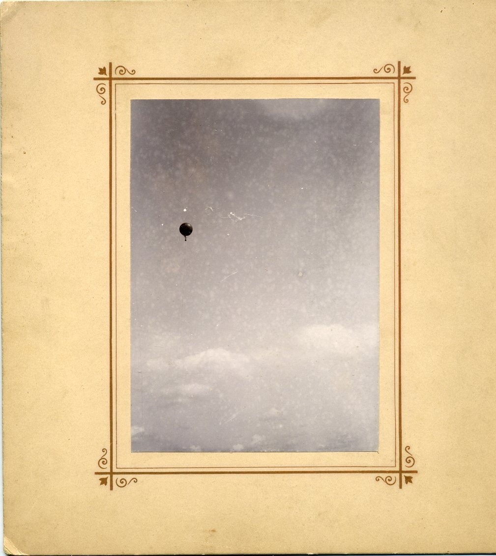 S A Andrée i luften med ballongen Svea. Från ballongkorgen hänger en släplina som anas som ett smalt streck.