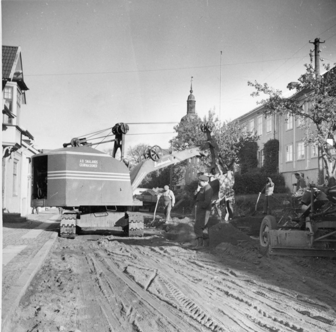 Fyra män vid en grävmaskin i arbete. Södra delen av Brahegatan i Gränna breddas.