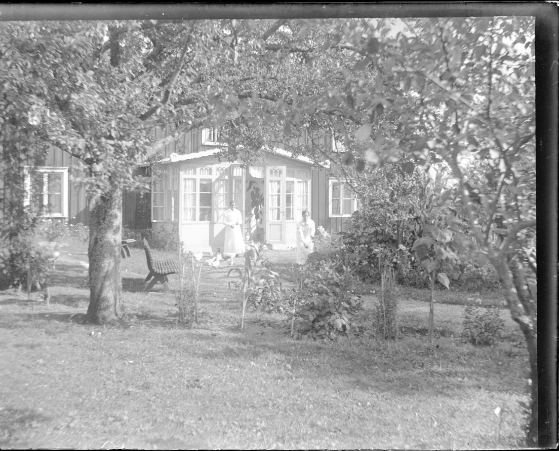 En tvåvåningsbyggnad med locklistpanel och vitmålad inglasad veranda skymtar bakom grönskande träd. Två kvinnor i ljusa klänningar, och några höns i trädgården. Det är sommar.