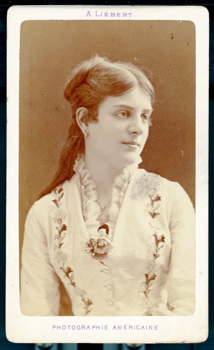 Kabinettsfotografi: okänd ung kvinna med ljust livstycke med spets vid halslinning, en ros lodräta broderade blomsterrankor över bröstet.