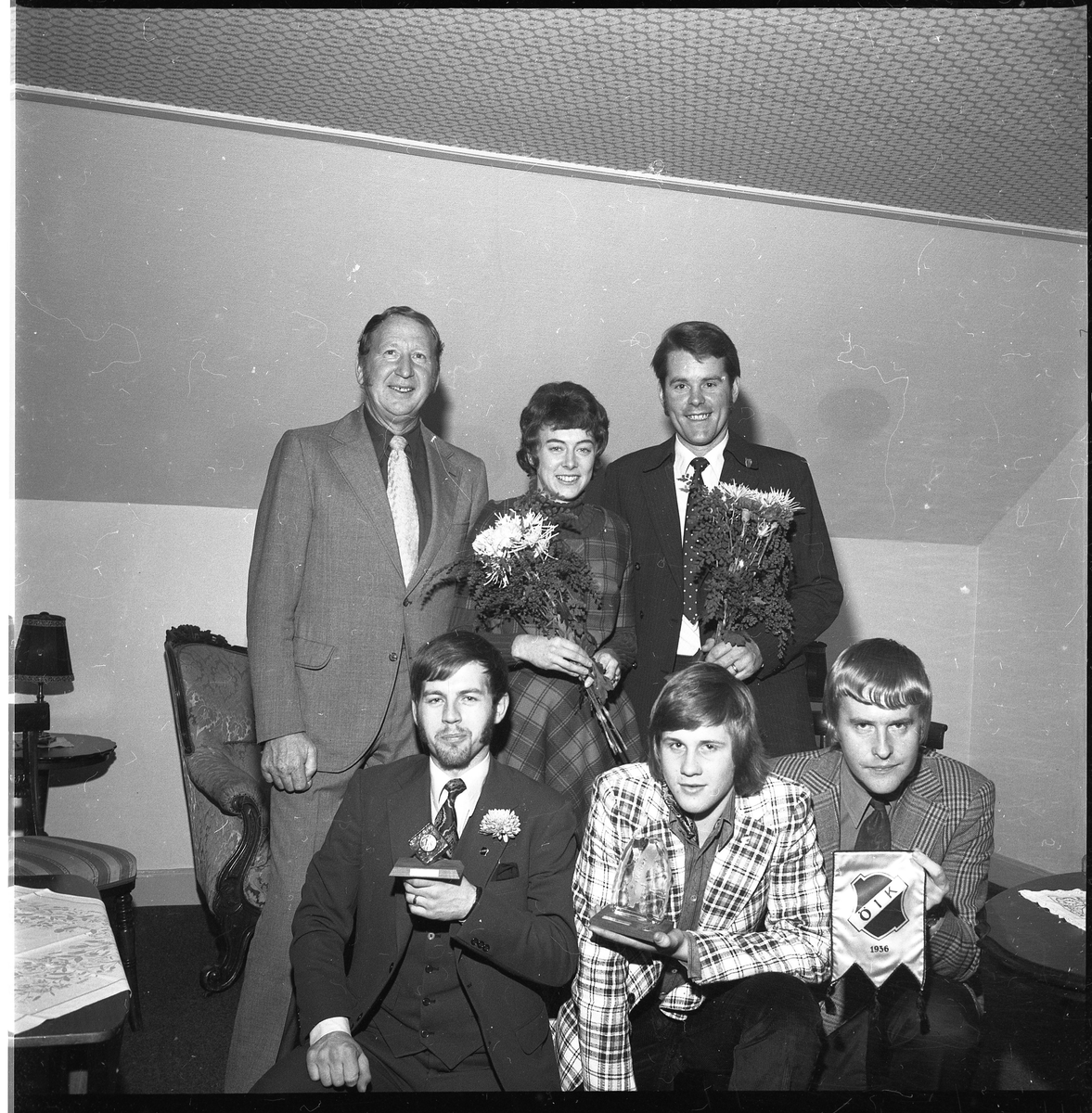 Fem män och en kvinna uppställda i två led, med blommor och utmärkelser i händerna.
