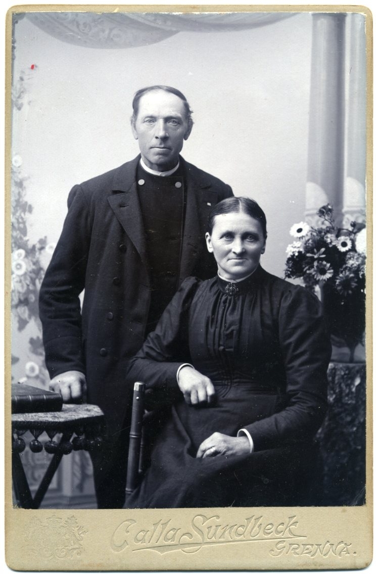Kabinettsfotografi: ett äldre par. Kvinnan sitter på en stol vid ett litet runt bord där det ligger en bok. En man står bakom henne.