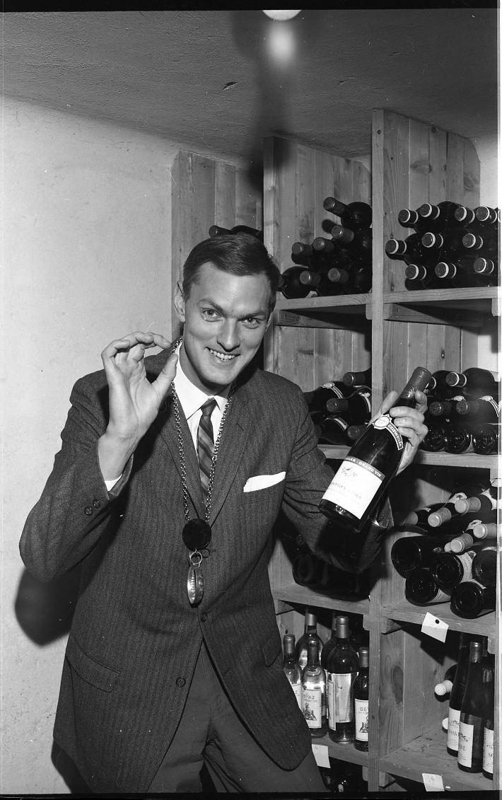 En man står i en vinkällare och håller upp en flaska mot fotografen. Han gör tecken för ett högklassigt vin.