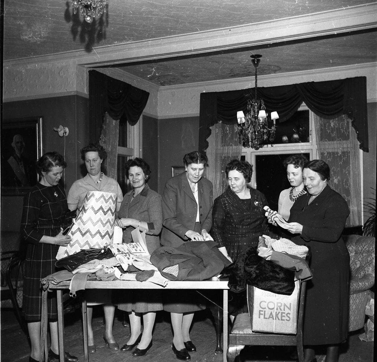 Sju damer står vid ett uppställt bord på vilket det ligger en klädhög, bland annat kavaj och strumpor. Där ligger också ett paket med julpapper och en kvinna till vänster klipper inslagningspapper från en rulle. En kartong märkt "Corn Flakes". Från vänster: B Heldebrandt, E Gustafsson, M Antonsson, K Lindén, M Grennfelt, B Thordott samt C Wendel.