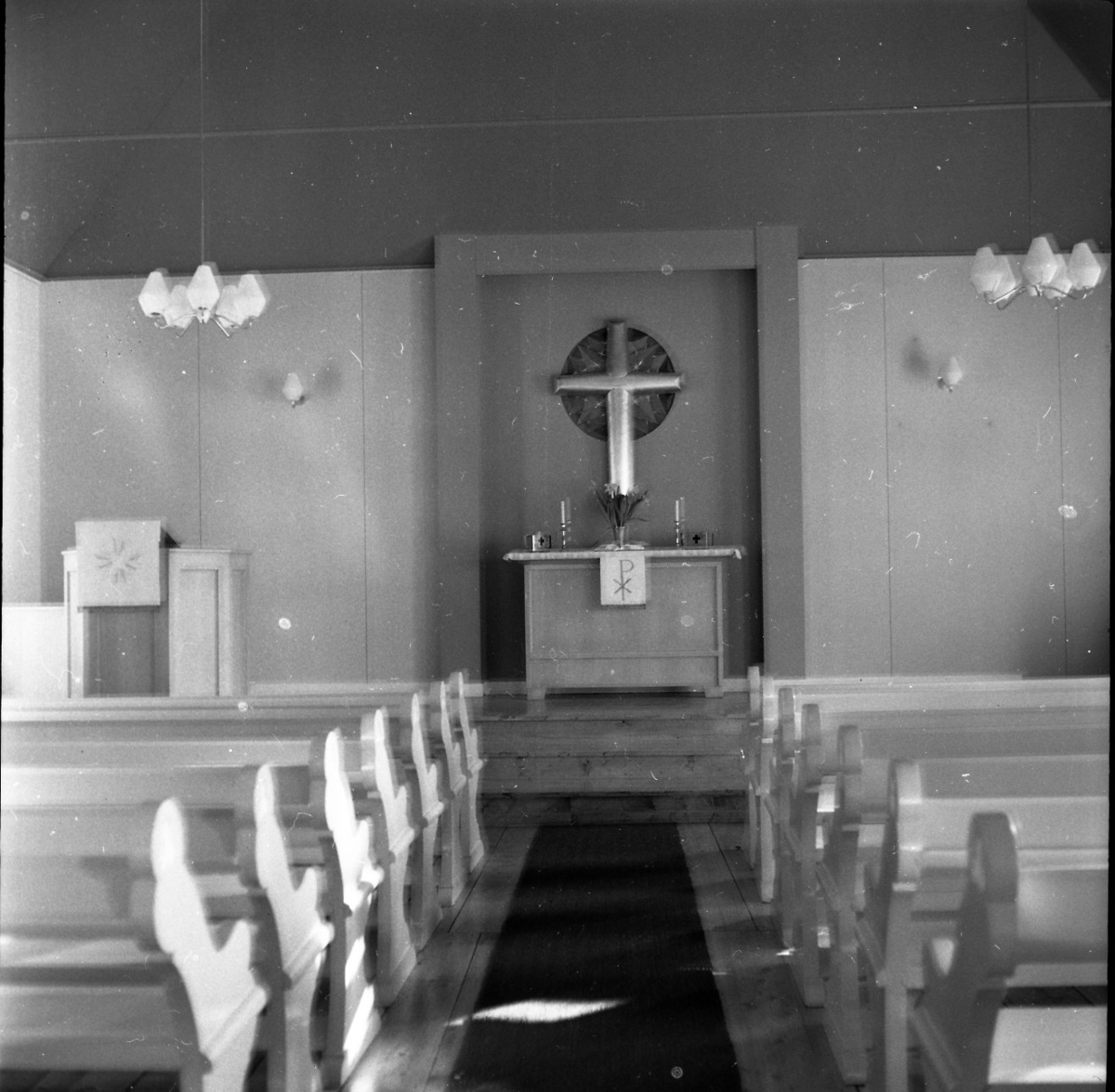 Bilden föreställer mittgången i ett missionshus som leder fram till ett altare. Längst med mittgången står bänkar. På väggen över altaret hänger ett kors.