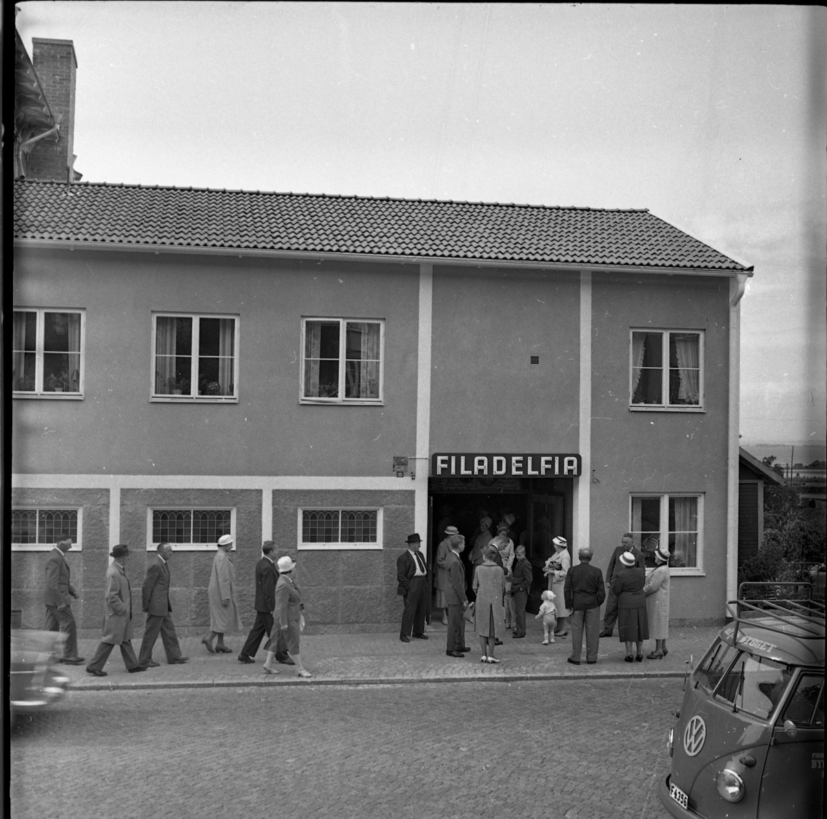 Många besökare på väg in till Filadelfiakyrkan. En VW-pickup står parkerad på Brahegatan.