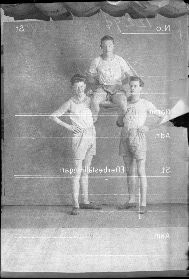Tre unga manliga gymnaster. En sitter på kamraternas armar. En av dem är Weiger från Gränna.