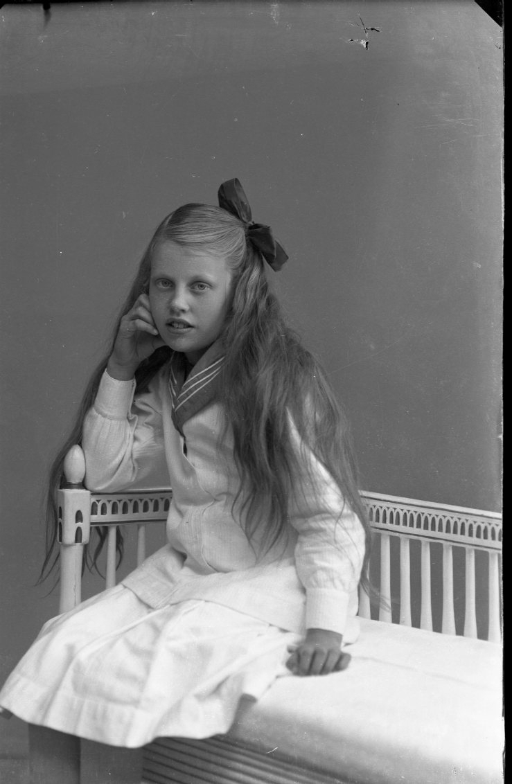 Porträtt av en flicka med rosett i långt hår, i klädd ljus klänning med sjömanskrage. Hon sitter i en soffa av gustaviansk modell.