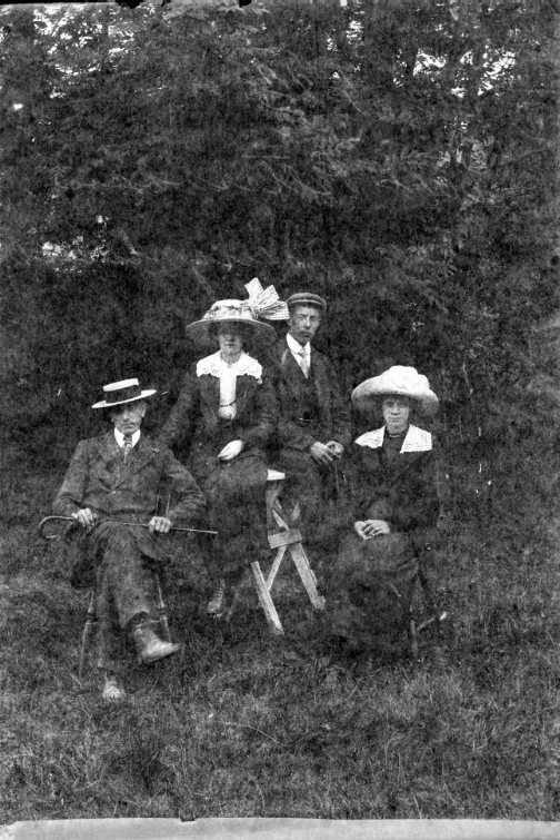 Två män och två kvinnor, sitter på stolar och på ett bord på bockar, på en gräsplan. Alla bär hatt. Den ena mannen har en spatserkäpp i knät.