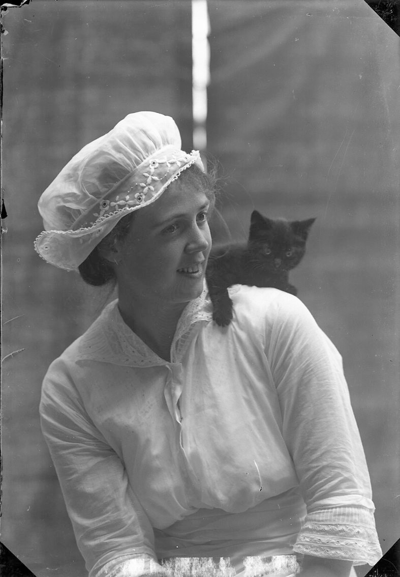 Porträtt av en ung kvinna med en kattunge på axeln. Bröstbild. På huvudet har hon en hatt i tunt ljust tyg med broderi på brättet - en sommarhatt.