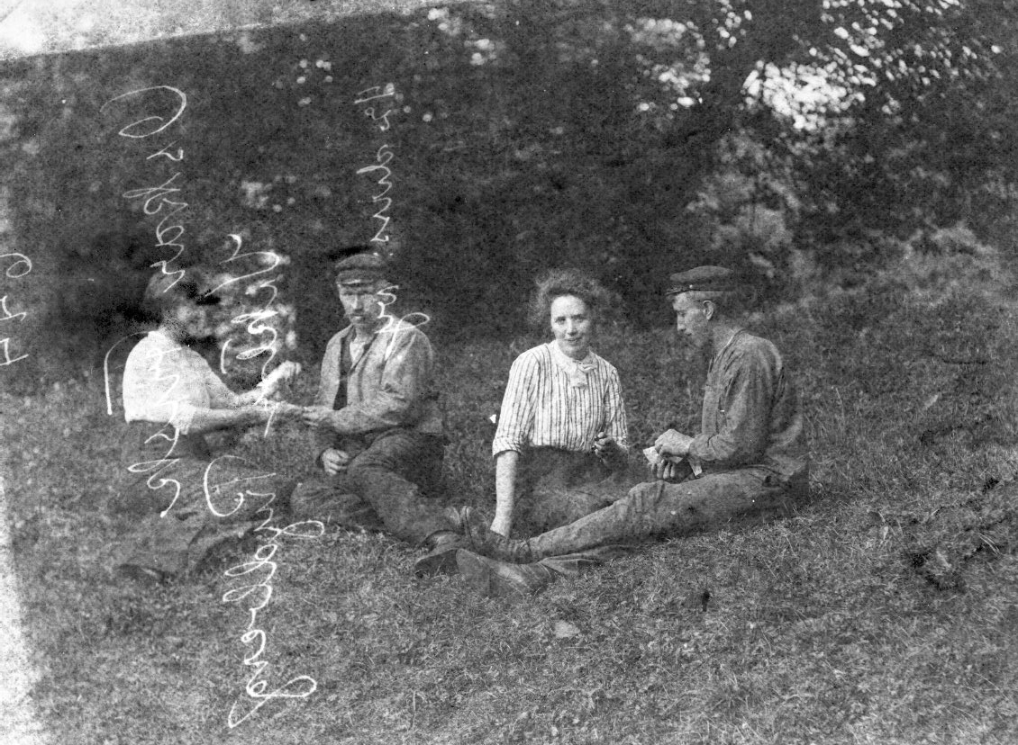 Två unga par sitter på en gräsmatta och dricker kaffe, eventuellt. De är vardagsklädda, männen har keps på huvudet.