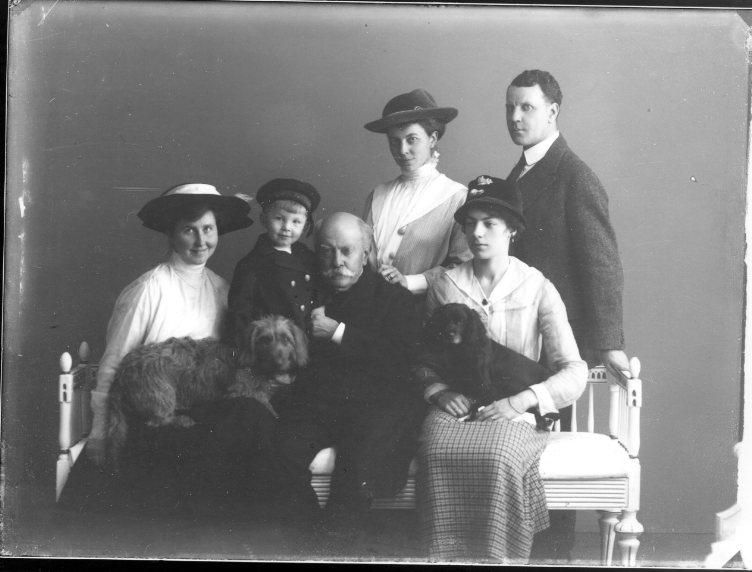 En äldre man sitter i en soffa med en liten pojke i sjömanskostym tätt intill sig, med en kvinna med hatt på vardera sidan. Bägge dessa kvinnor har en hund i knät. Bakom dem står ytterligare en kvinna med hatt samt en man.