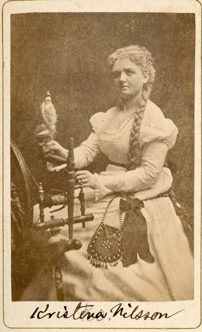 Kabinettsfotografi av en kvinna med lång fläta som sitter vid en spinnrock.