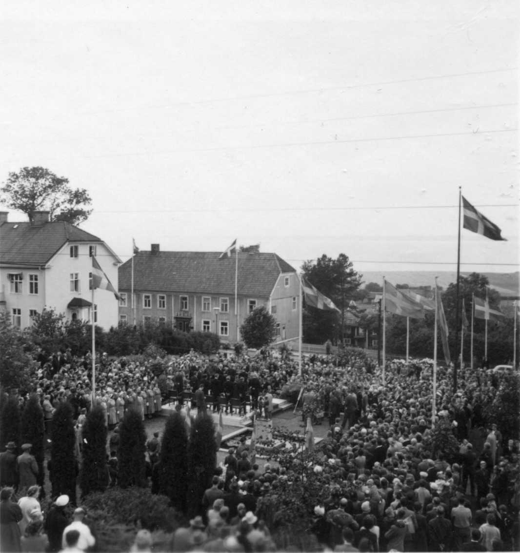 En folksamling runt en tillfällig scen i Braheparken i Gränna i samband med Eriksgata. Hissade flaggor.