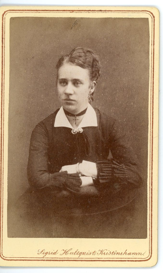 Kabinettsfotografi av en kvinna. Hon har ett band runt halsen med ett kors.