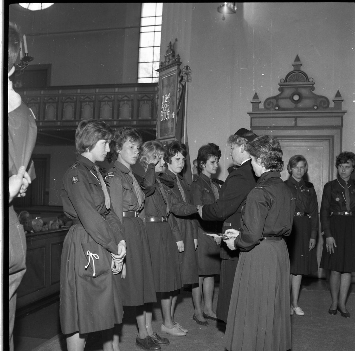Några unga scouter står uppradade framför en scoutledare i en kyrka. Scoutledaren skakar hand med en ung kvinnlig scout. Den unga kvinnan gör honnör.