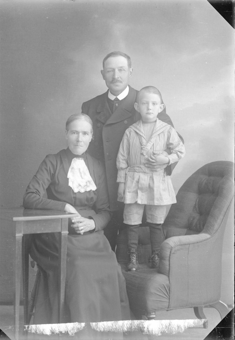 Porträtt av ett äldre par med en liten pojke. Pojken står i en fåtölj och kvinnan sitter på en stol bredvid. Mannen håller sin arm om pojken.
