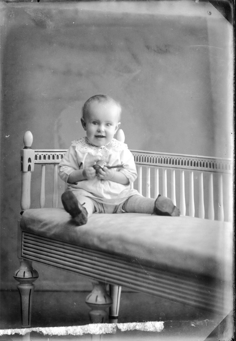 Porträtt av ett spädbarn som sitter i en soffa av gustaviansk stil. Pojken håller möjligen i en skallra.