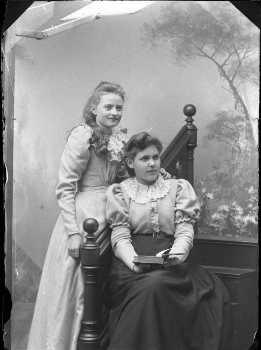 Två unga kvinnor intill varandra. Ester Grönberg står till vänster och har sin hand på axel på en okänd kvinna som sitter i trappa med en bok i knät.