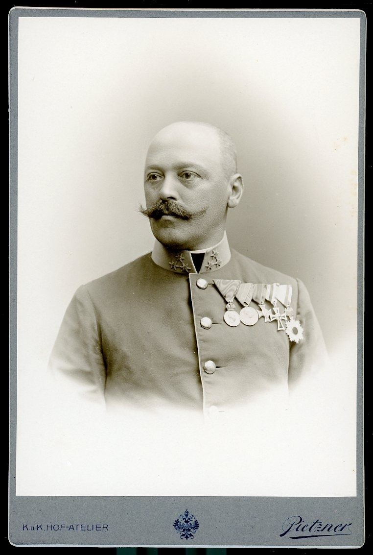 Kabinettsfotografi: Hugo Fischer von See, österrikisk-ungersk överste med medaljer på bröstet.
