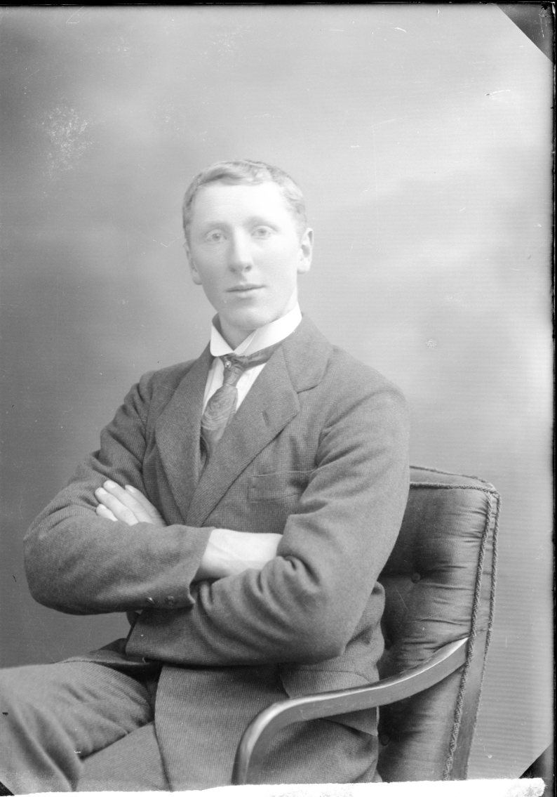 Porträtt av en ung man med slips. Han sitter på en stol med armarna i kors.