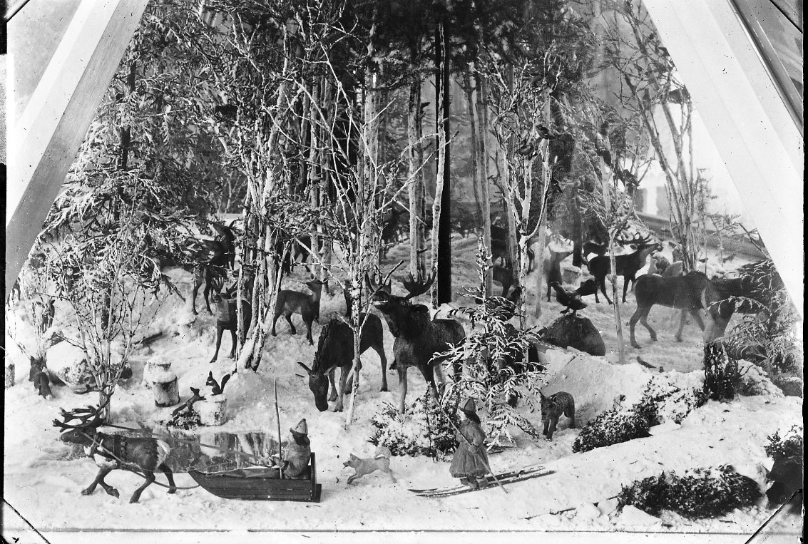Titel: Fotografi av Fredrik Hård af Segerstads diorama med skulpterade figurer från livet på landet i Reaby och i landet generellt: "Biologi i skulptur". I dioramat syns ett vinterlandskap med älgar, renar och samer.