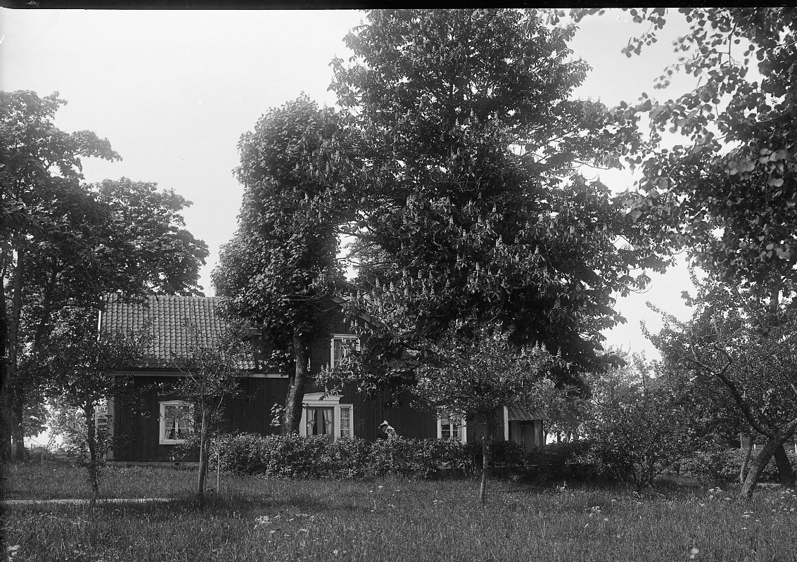 En envåningsbyggnad med locklistpanel och frontespis bakom höga träd.