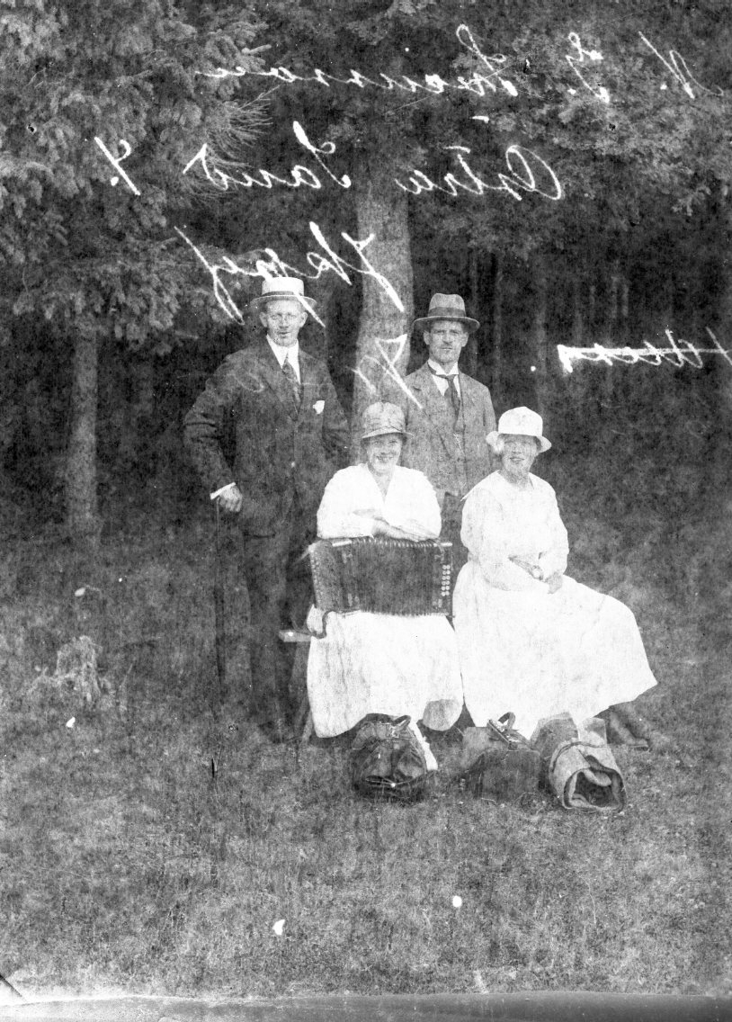 Två kvinnor i liten hatt och ljusa kläder sitter på en bänk vid ett skogsparti. Bakom dem står två män. Mannen till vänster har möjligen ett paraply i handen. Kvinnan till vänster håller ett dragspel. På marken framför dem står ett par väskor.