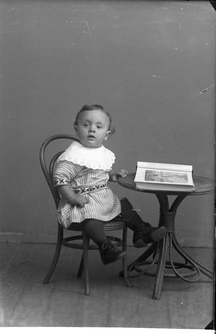 Porträtt av en liten pojke som sitter i en barnmöbel med en bok uppslagen på bordet.