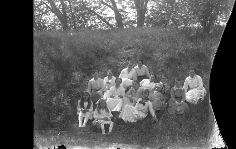 En grupp kvinnor och flickor sitter i en grässlänt. Det är sommar.