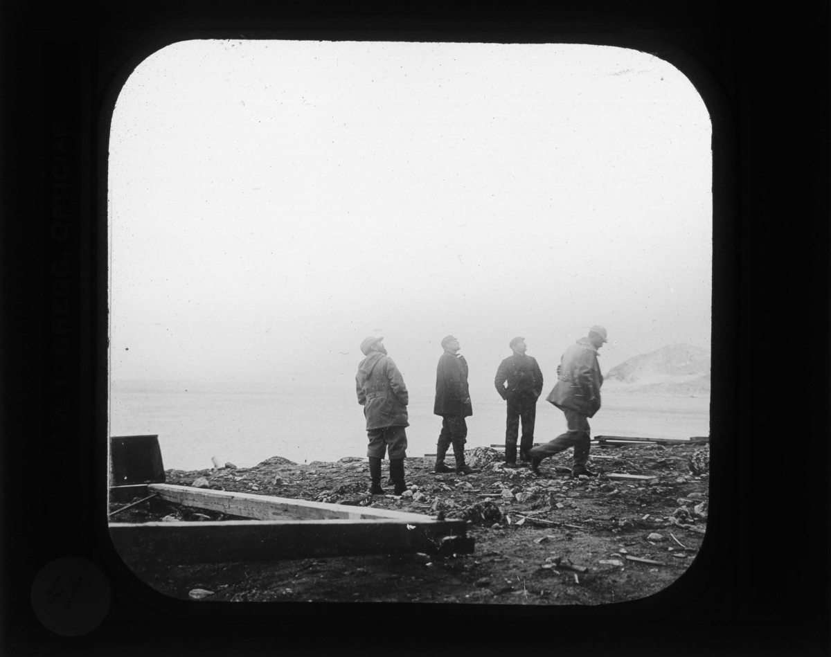 S A Andrée med flera med blicken mot ballonen. Möjligen avresedagen 11 juli 1897.