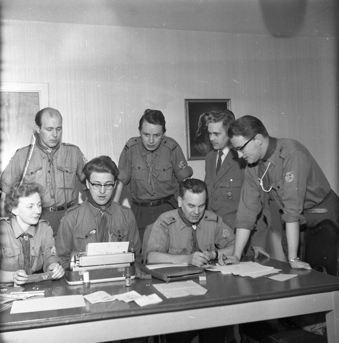 Sex män och en kvinna befinner sig vid ett skribord. Tre personer sitter, varav en sitter framför en skrivmaskin. Fyra personer står lutade över de sittades.
