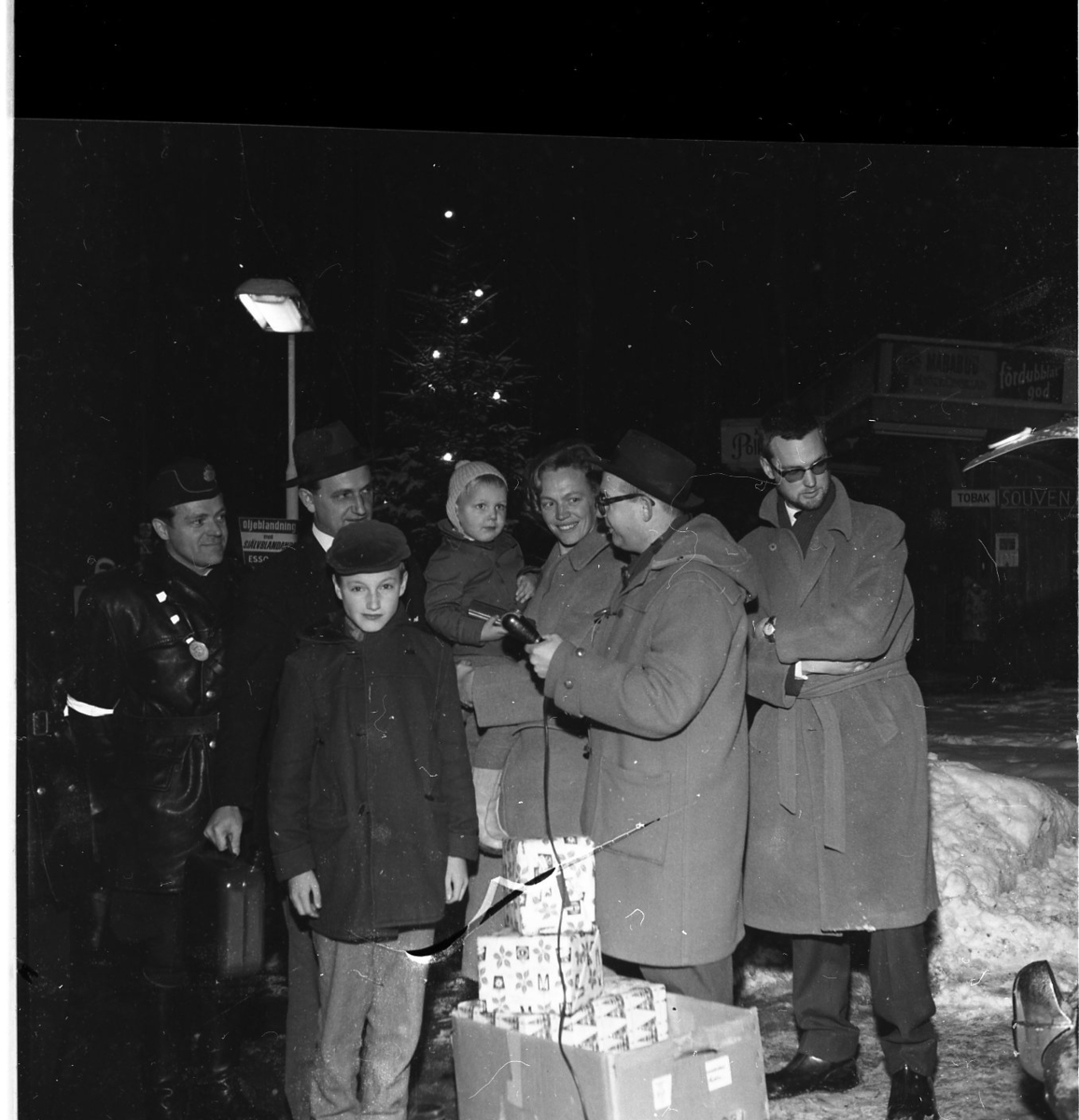 Några människor står i en klunga. Bakom dem står en julgran. Det är mörkt ute. Bland människorna i klungan finns en polis, en kvinna med ett barn på höften och i mitten står en man med en mikrofon i handen. En låda med inslagna paket står vid fötterna på dem.