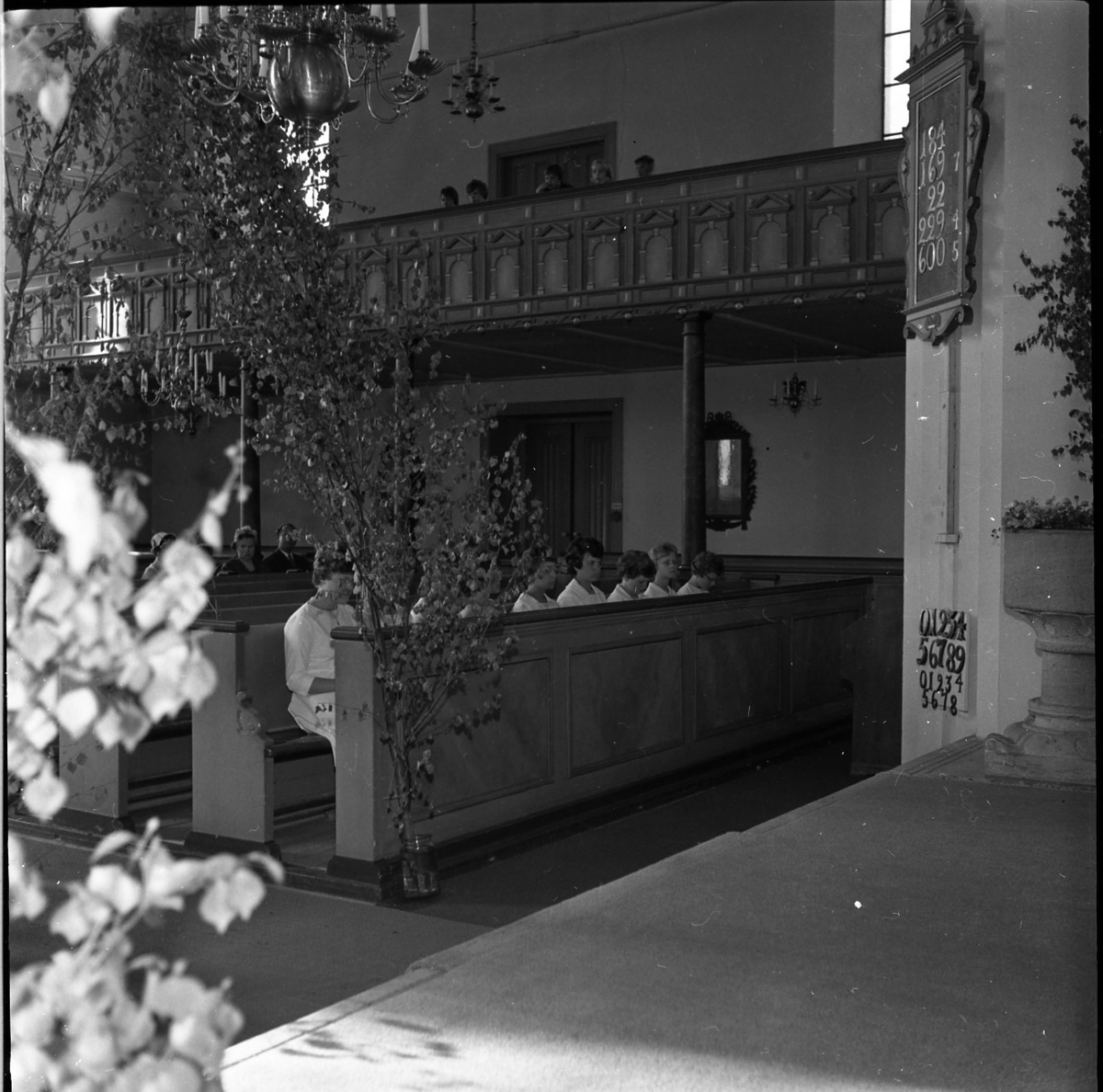 Interiör från Gränna kyrka i samband med konfirmation. Kvinnliga konfirmander sitter i en bänkrad längst fram.