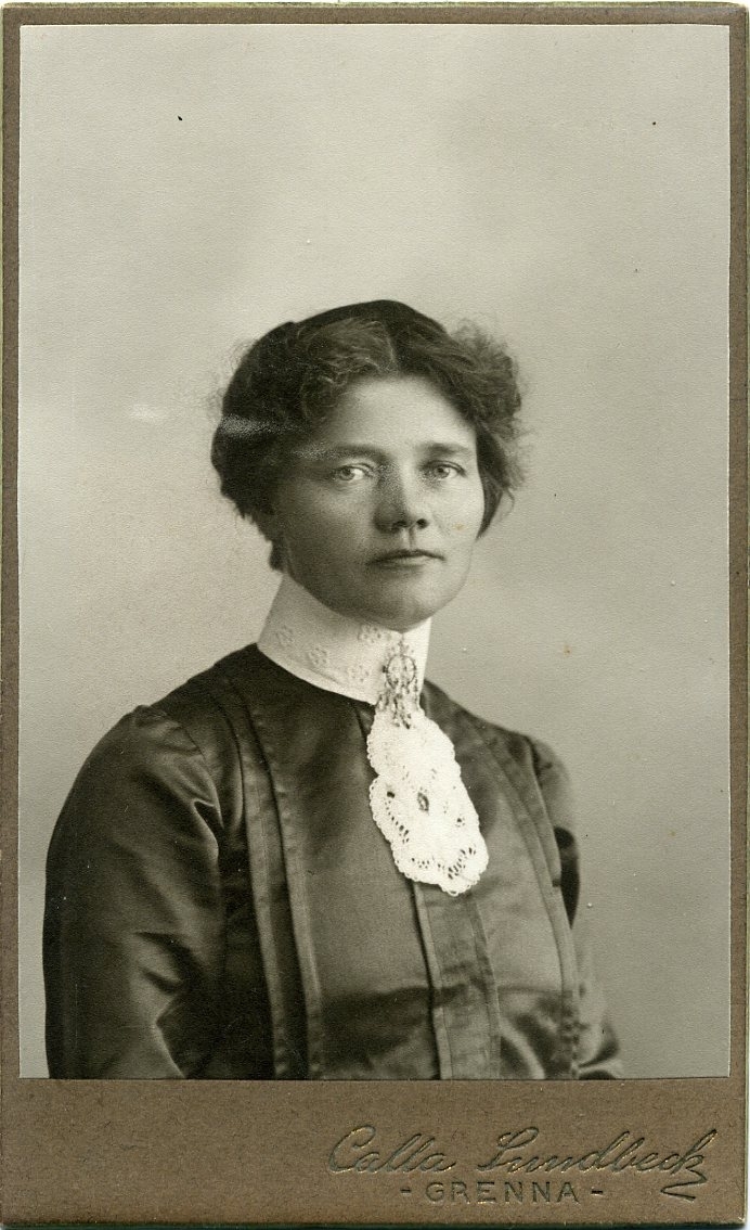 Kabinettsfotograf: en kvinna med hög vit krage och bröstlapp.