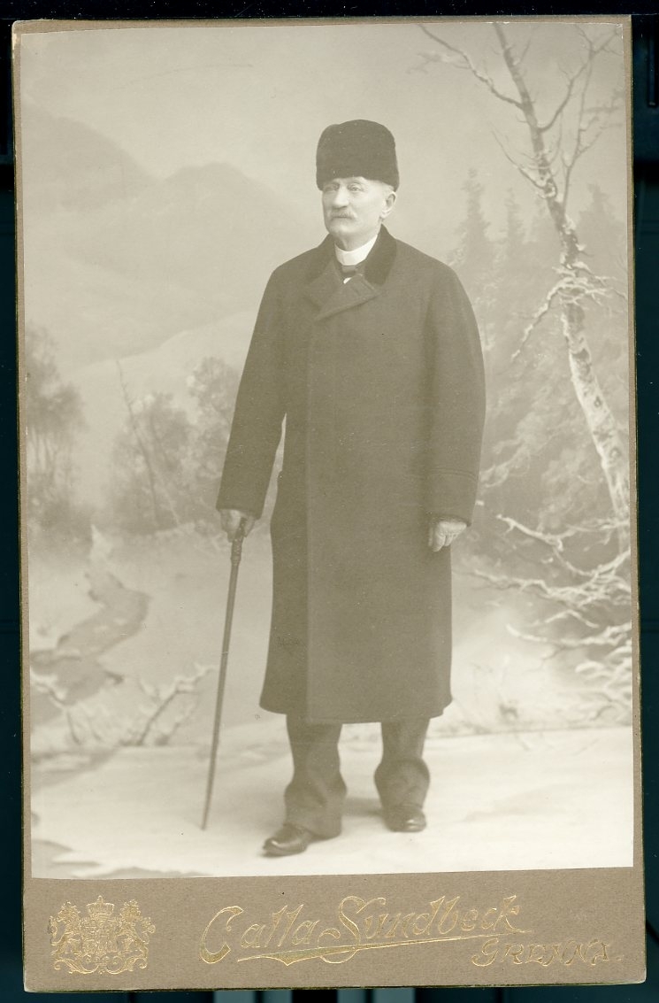 Kabinettsfotografi: A W Hall i rock, pälsmössa och käpp i ateljé med vinterkuliss.