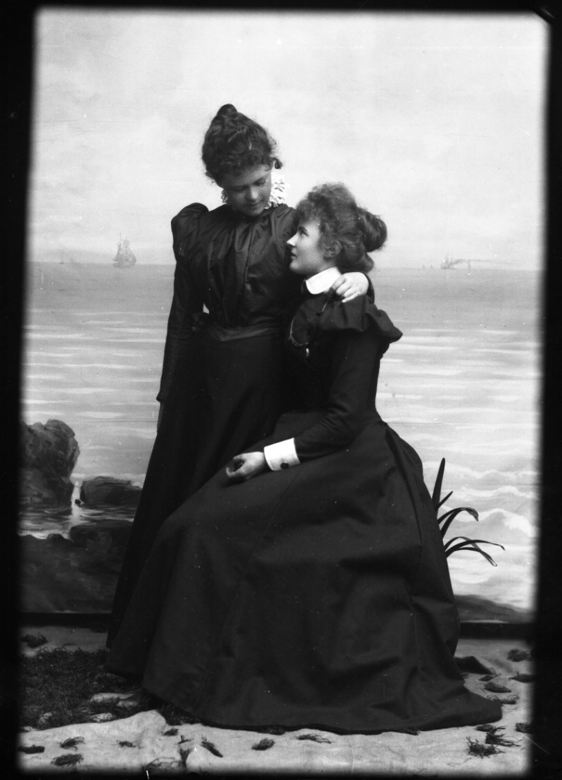 Två kvinnor. Sannolikt Ester Grönberg sittande till höger intill en okänd kvinna som står tätt intill och håller sin vänstra arm om hennes nacke. De tittar förtroligt mot varandra. Mot en marin fond med hav och enstaka fartyg.