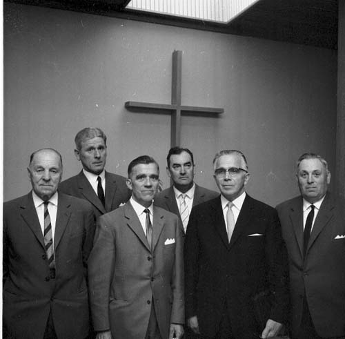 Sex herrar i mörka kostymer och slips står uppställda framför ett kors. Som nr 2 står Rickardsson, som 4 Olofsson och som 5 Svensson.