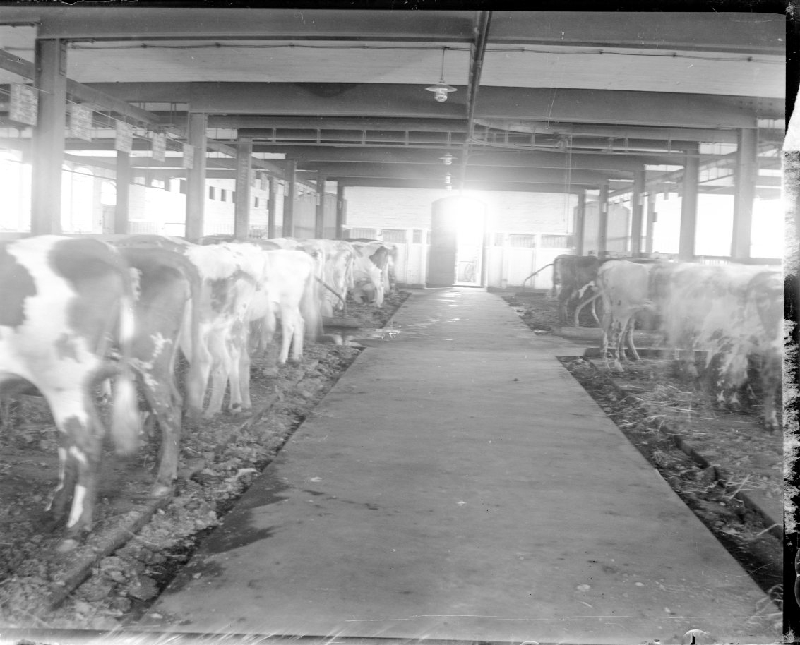 Titel: En ladugård med kor på rad.