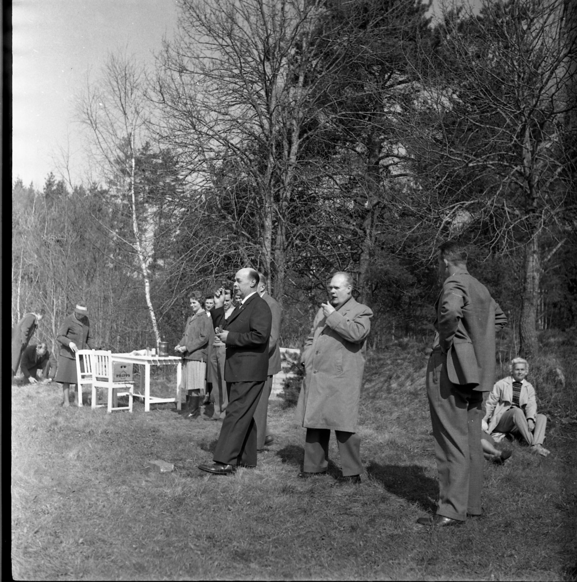 Män och kvinnor ute i det gröna. En grupp med trädgårdsmöbler till vänster. I bildens centrum en man i mörk kostym som sannolikt spelar Dart. Intill står en man pipa i munnen, det är Holger Andersson.