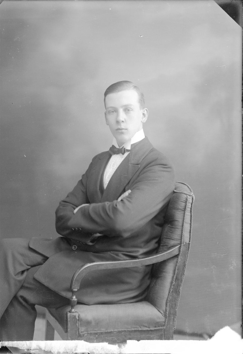 Titel: Porträtt av en pojke i övre tonåren som sitter på en stol med armarna i kors.