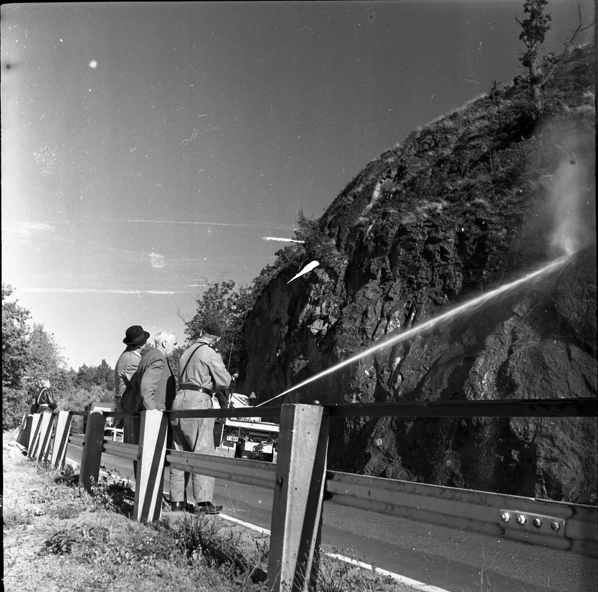 Rasberget vid länsgränsen 1961. En vattenkanon åker längst med en motorväg och har kanonen riktad mot en bergvägg. Vattnet träffar högt upp på berget och nedanför ligger rasmassor. Mot vägstaketet står tre herrar lutade, en av dem är polis.