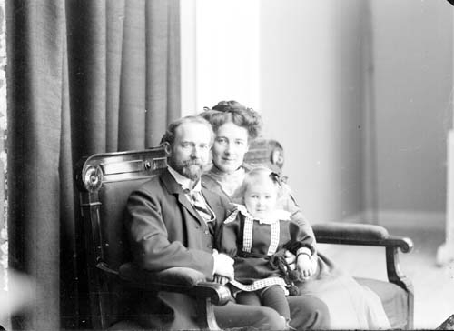 "Fru Rydberg". En man och en kvinna sitter intill varandra med ett litet barn i knät. Det är sannolikt herr och fru Rydberg med dottern Anna Lisa, född 1908.