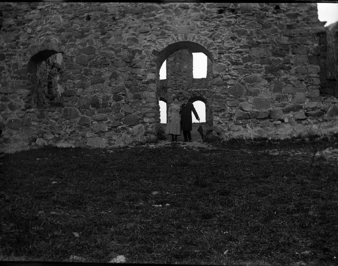 En ung kvinna och man står i en valslagen öppning till Brahehus slottsruin. De bär kappa/rock och hatt. Det är möjligen syskonen Anna-Lisa och Karl-Axel Rythén.