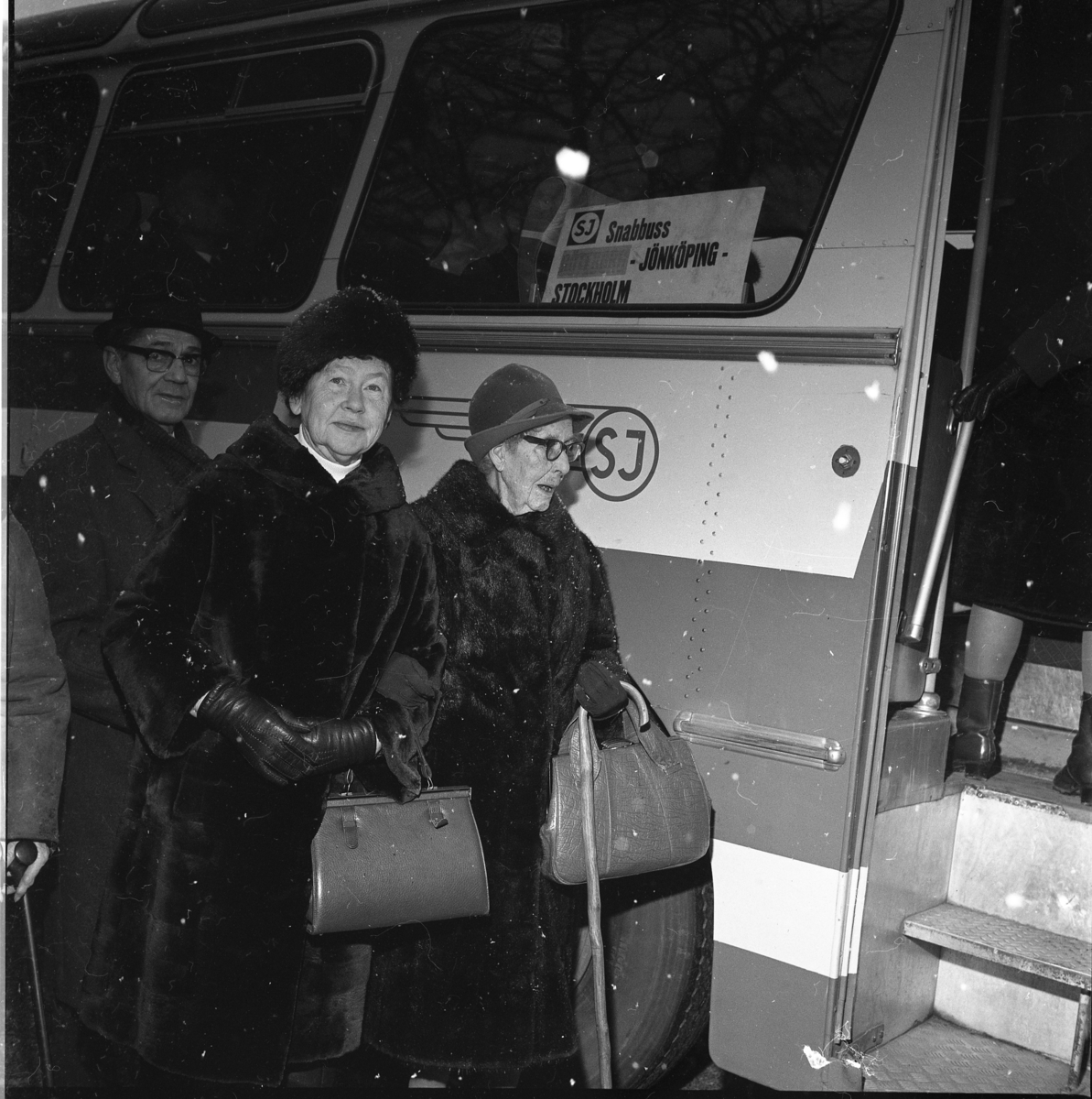 Två pälsklädda damer och en herre är på väg att gå ombord på en buss som trafikerar Jönköping-Stockholm.