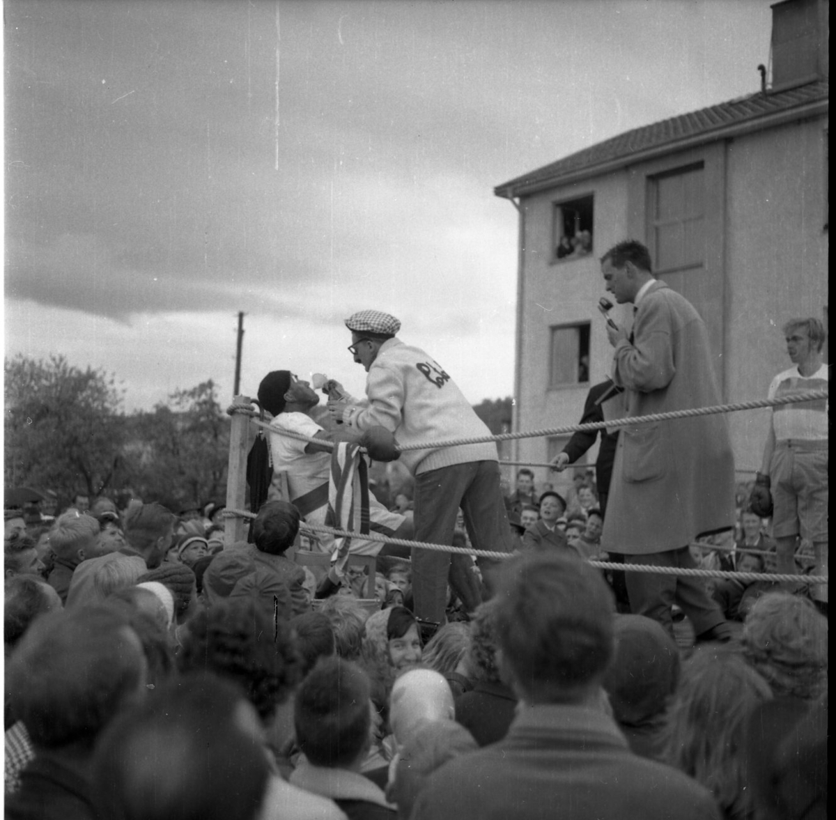 En boxningsring uppställd på gården till Realskolan i Gränna, omgiven av mycket folk. I realskolans öppna fönster mot gården syns många åskådare. I vänstra ringhörnan sitter en boxare och tas om hand av sin tränare. En man i ljus rock är speaker, hans namn är Rolf von Otter.