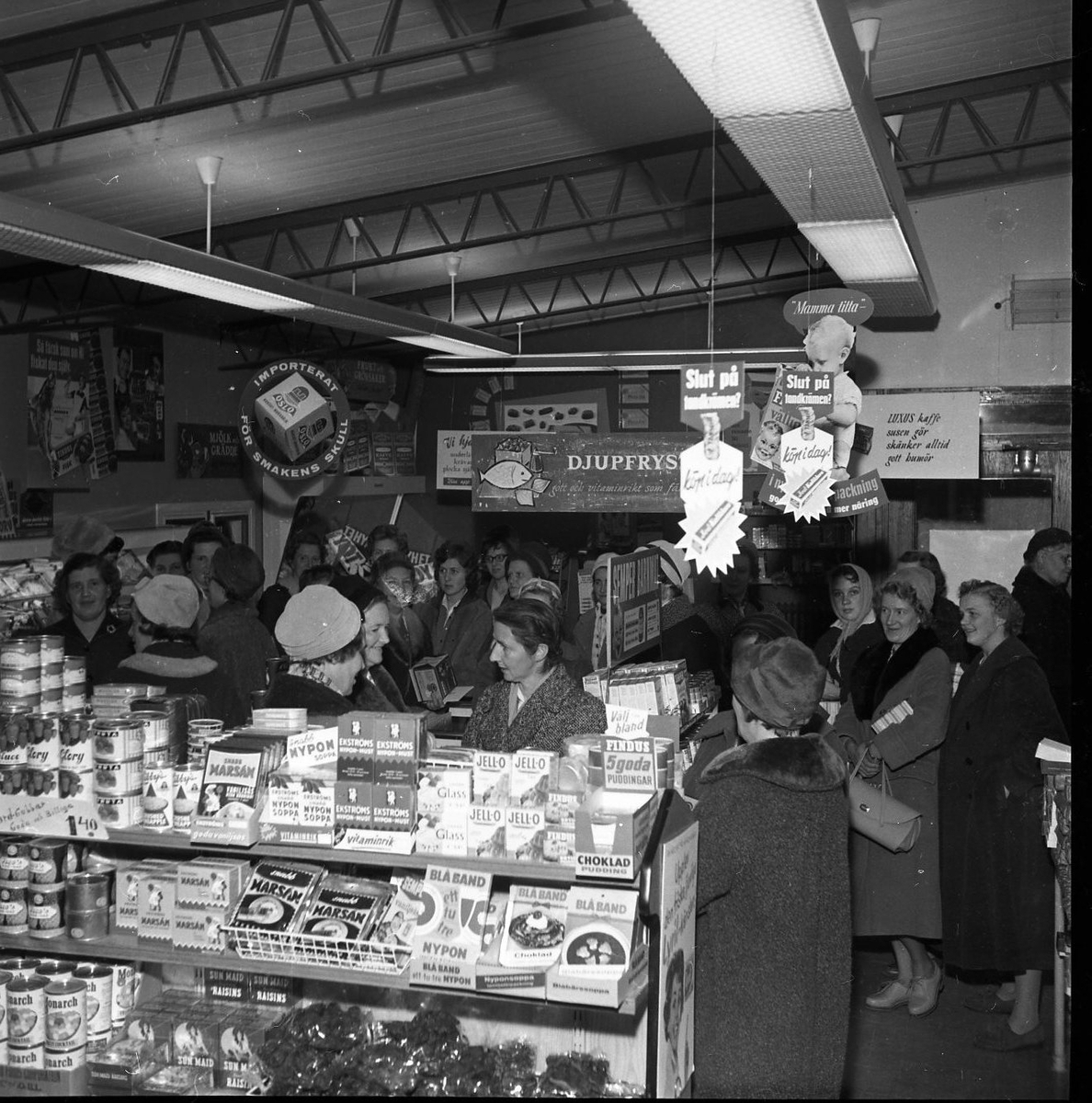 Kvinnor står packade i en mataffär. Från taket hänger reklam för mat och tandkräm. På hyllorna står matvaror med varumärken som Ekströms, Blå band och Jell-o.