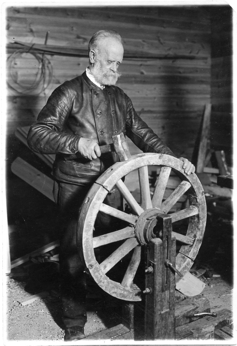 En äldre man med skägg och klädd i skinnjacka arbetar på ett vagnshjul av trä.